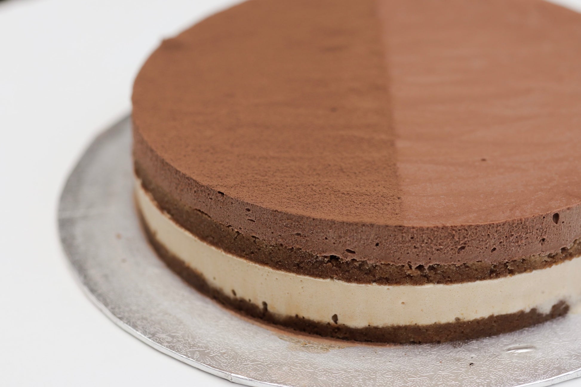 Coffee & Vanilla Rum Sponge, Coffee Semifreddo, 54.5% Chocolate Semifreddo, Cocoa Powder.